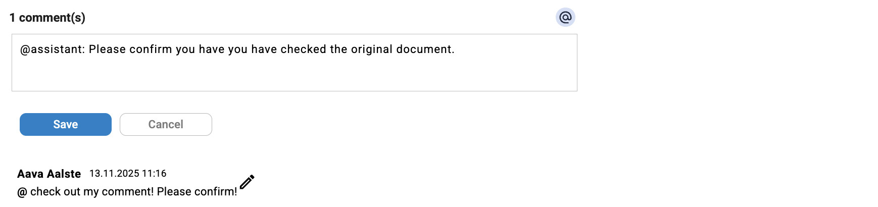 Send your comments directly to your colleagues or clients by addressing them with the @ in the comments field. Type the symbol directly in the input field or click on it to get a list of all the users with the required rights.