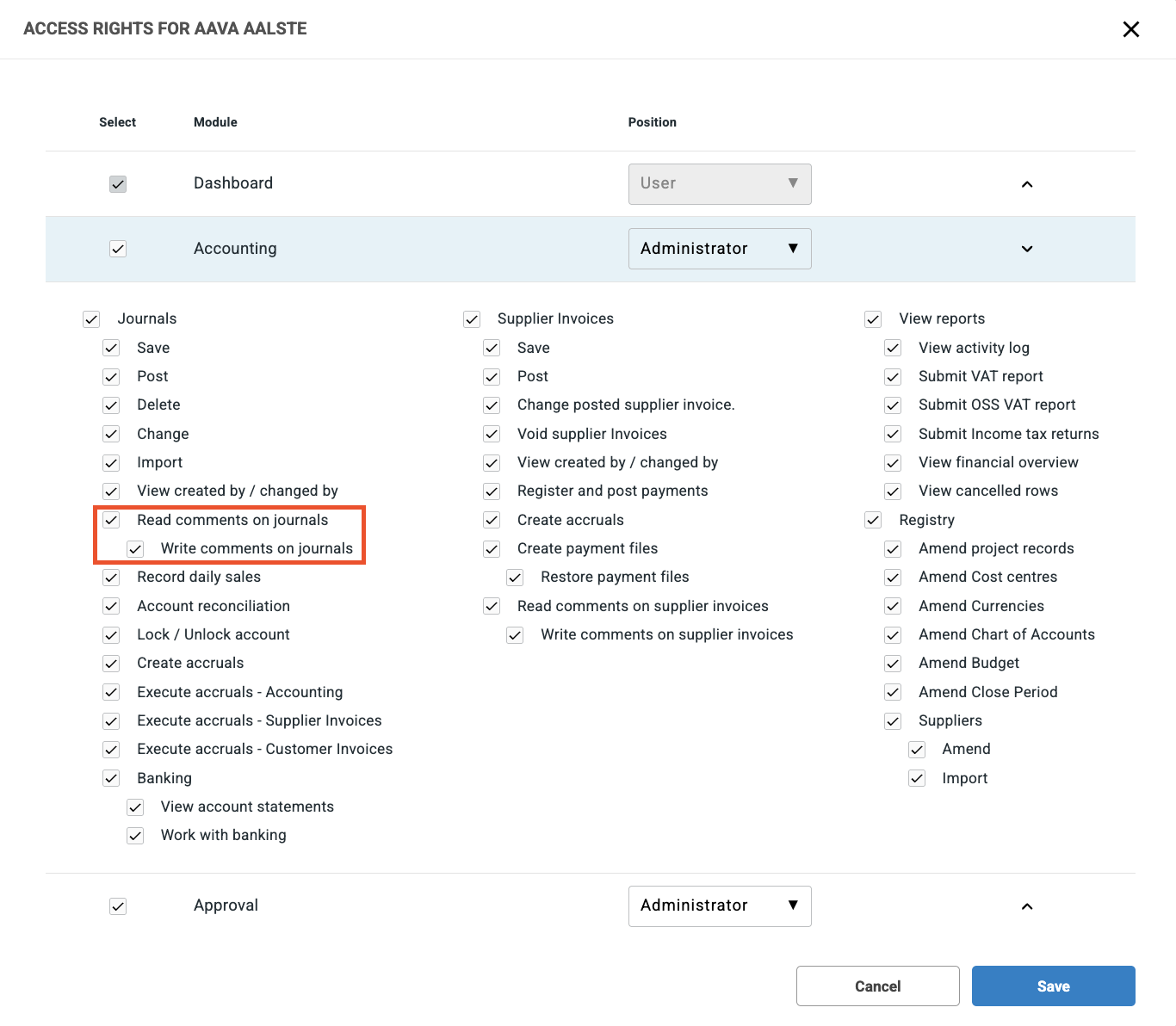 If you are several users in your account, you can “send a comment” to any one of the users with the right to read and/ or write comments, so that they can comment back or just check the journal.