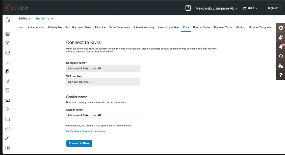 - Send customer invoices directly from Briox to recipients' Kivra accounts.
