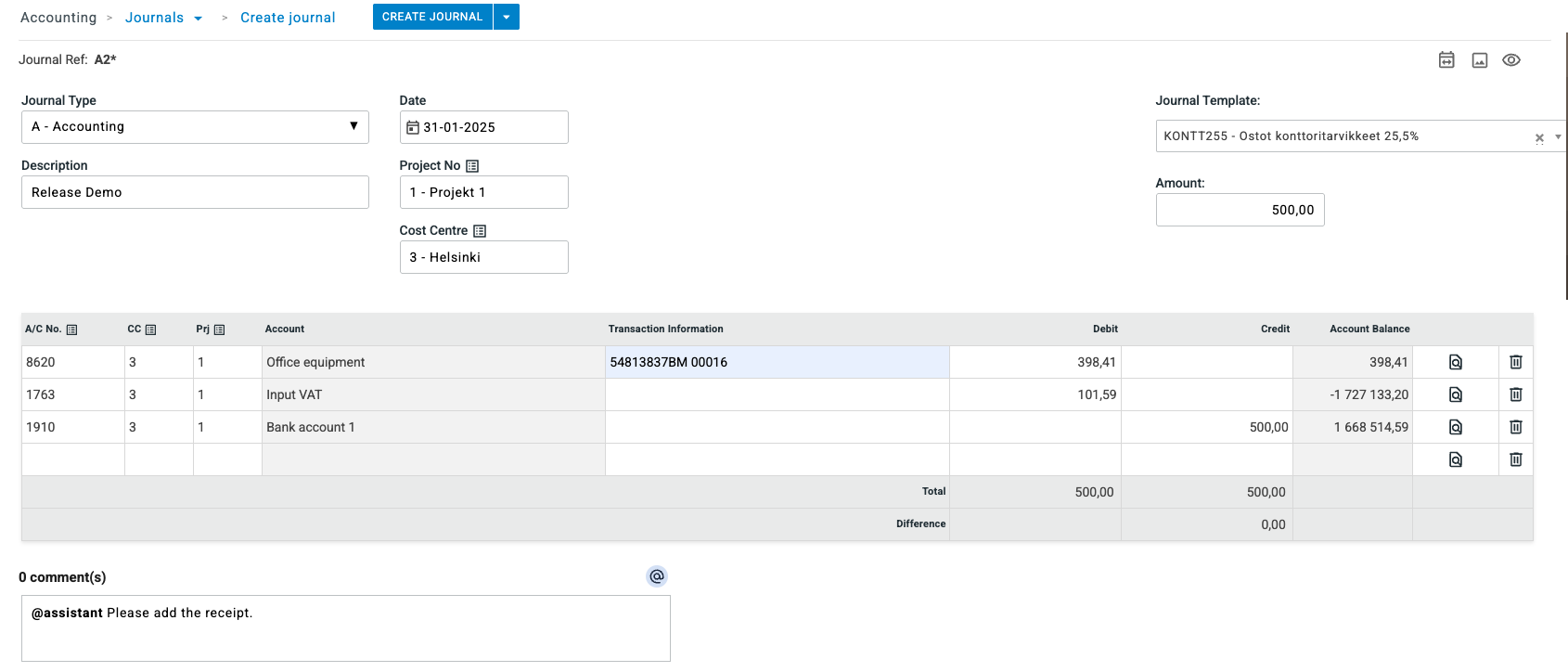 This works also in customer and supplier invoices. - When copying a journal, the crossed out rows will no longer be included in the new copy.