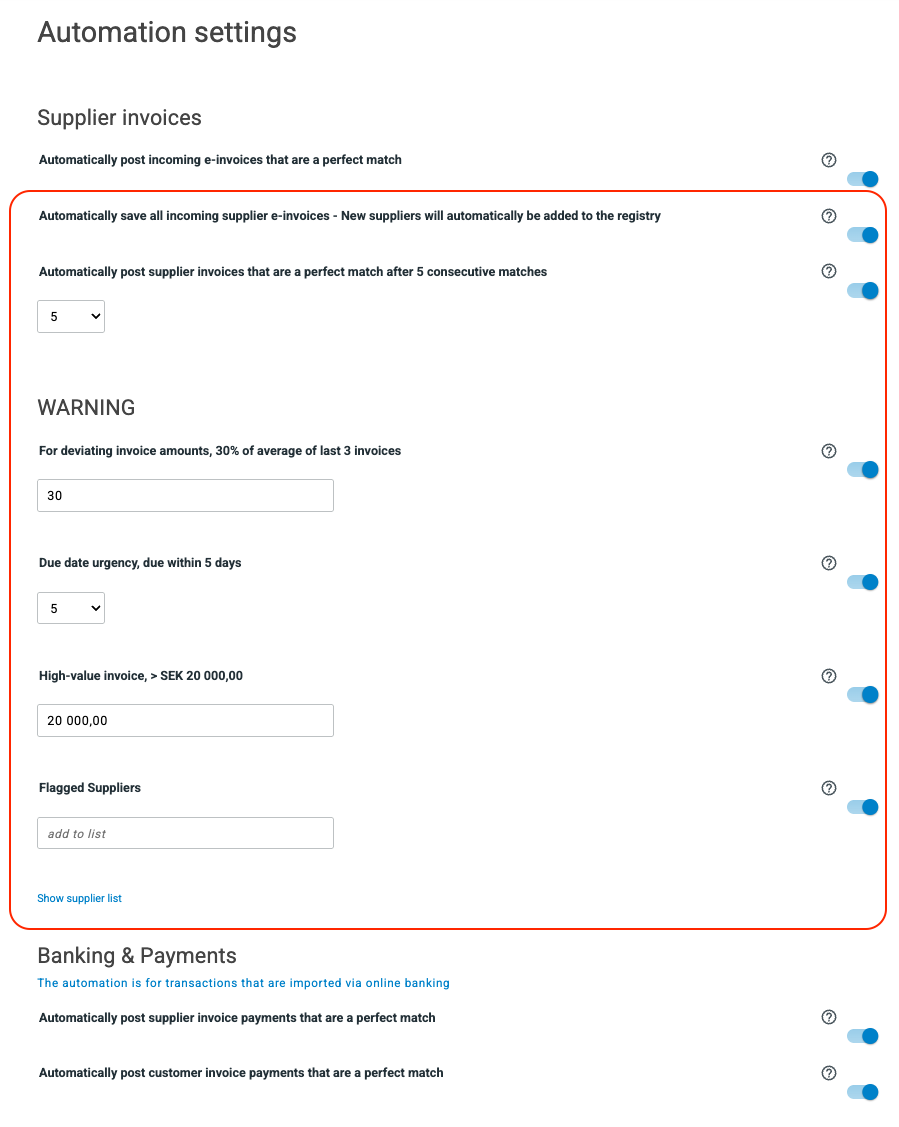 The automation settings for handling incoming supplier invoices have been improved with the following enhancements:
