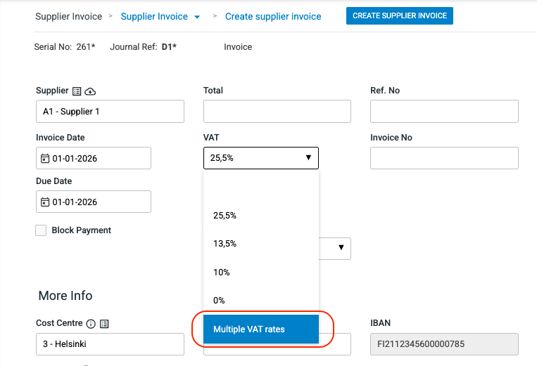 Use a template to automatically calculate your VAT in the supplier invoice. These are easily created by copying existing ones.