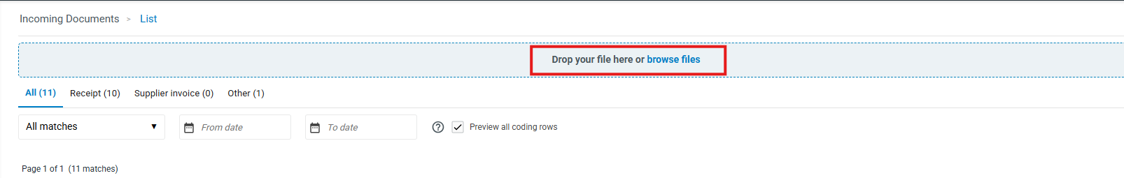 You can import customer-supplied document attachments that you want to enter into accounting in Briox into the program in bulk. Incoming documentssection. Artificial intelligence scans the documents you submit, which you can then export to your accounting system via the same section, either as receipts or purchase invoices.