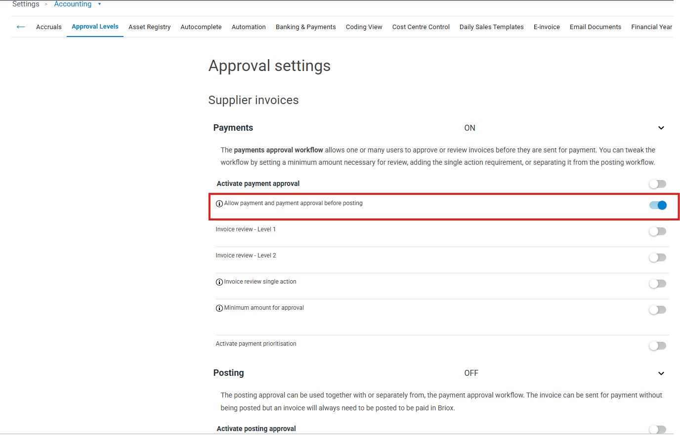 WE RECOMMEND to introduce at least Allow payment and payment approval before adding to accounting level; this allows the customer to pay a purchase invoice received in the program even if it is only saved in the purchase invoice list (not added to the accounts-status). This function, combined with the automation of purchase invoices in the previous section (automation settings), brings purchase invoices as smoothly as possible to the end user's view, where they can pay them.