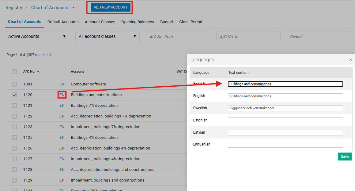 Opening a financial period activates the chart of accounts, an editable version of which can be found in the section Registry - Chart of Accounts. You can go there to set up customer-specific accounts that are not found in the model customer account chart you are using/Briox's default account chart. You can also edit the account names for each customer if you wish.