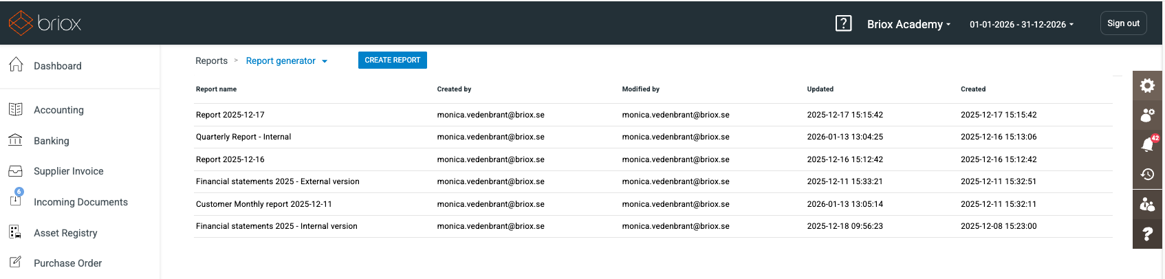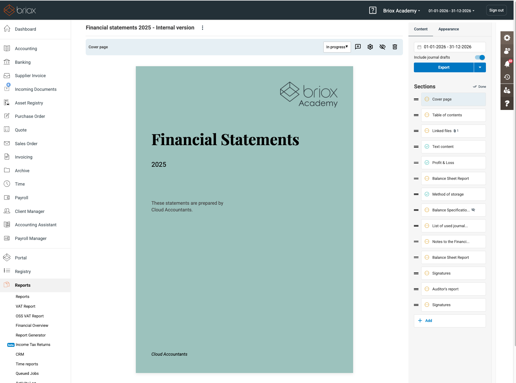 The report generator allows small and micro businesses to create professional report templates for many different types of reports, including financial statements, directly in Briox.
