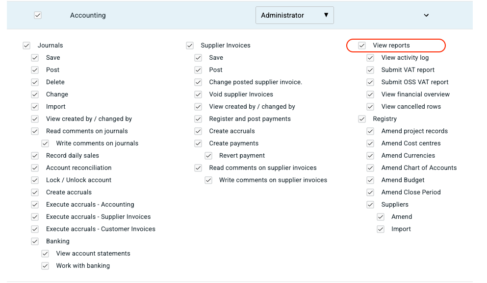 The report generator is an add-on module to Accounting, so a user who is to work with the report generator should have access to Accounting, Linked documents and the Report generator as a minimum.