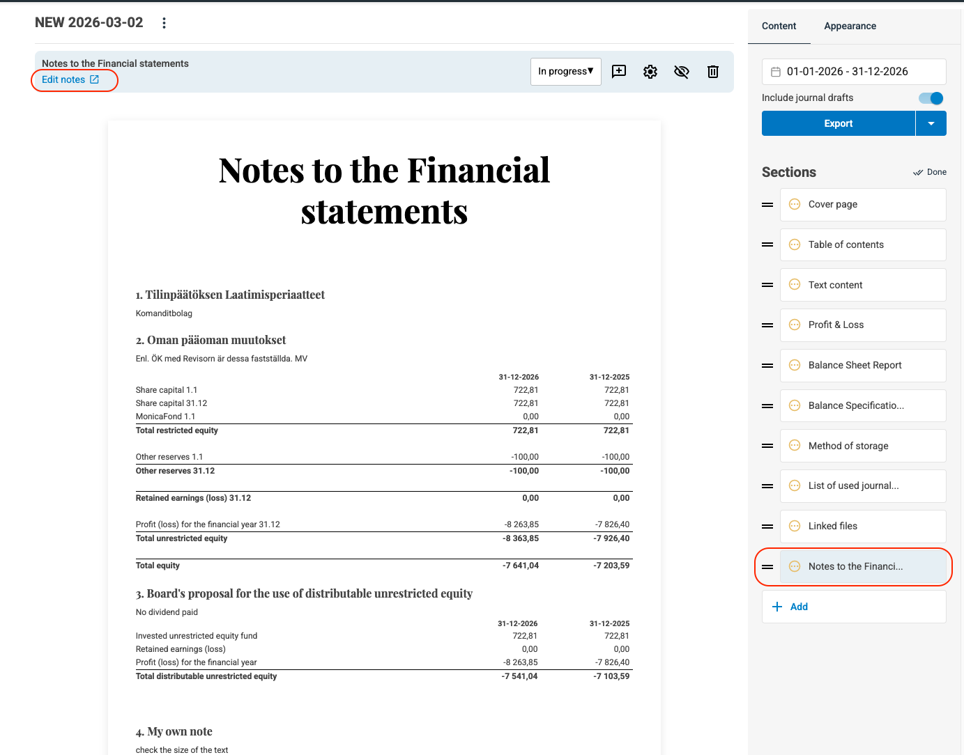 When you are done with the Notes, you can return to Reports - Financial statements, the Notes are now available as a part of the report.