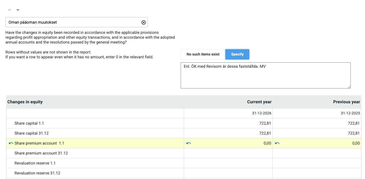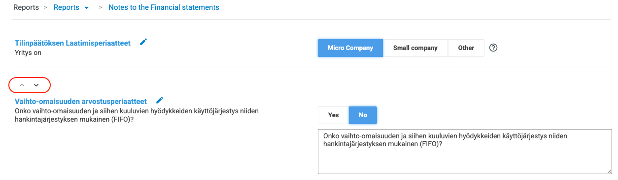 The Notes section is not really a report by itself, but it is an integral part of the Financial Statements report. According to the Finnish accounting law, completing the Notes is required from small- and micro sized companies. Here, a company can report shortly if there are any legally required comments to the report, for example a special status or the size of the business.