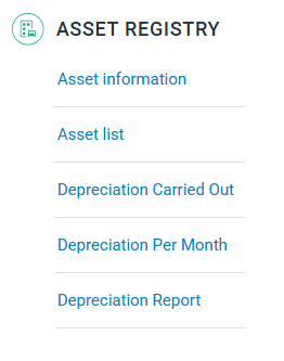 The Asset Registry comes with its own selection of reports which you can find under Reports - Reports - Asset Registry.