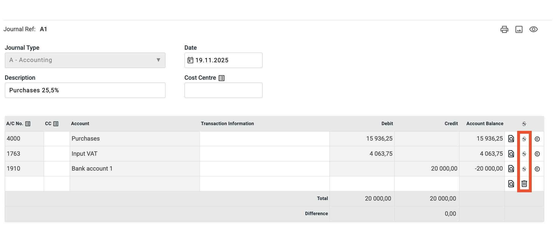 - This will open up an edit view of the journal where you can cross out existing rows and new rows that have been added.