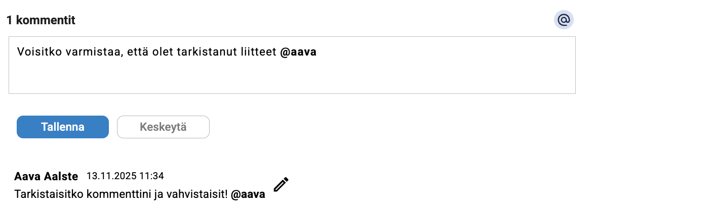 Lähetä kommenttisi suoraan kollegallesi tai asiakkaalle merkitsemällä heidät @-symbolilla kommenttikentässä. Kirjoita symboli suoraan kenttään tai klikkaa sitä nähdäksesi listan kaikista käyttäjistä, joilla on tarvittavat oikeudet.