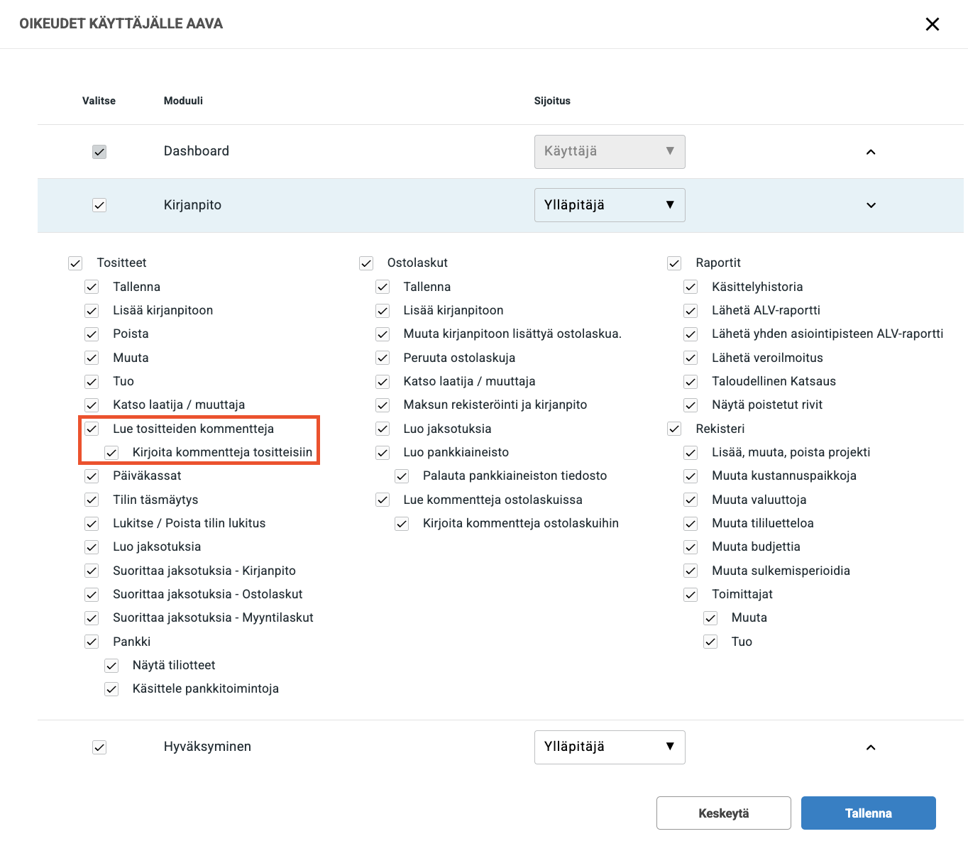 Jos tililläsi on useita käyttäjiä, voit “lähettää kommentin” mille tahansa käyttäjälle, jolla on oikeus lukea ja/tai kirjoittaa kommentteja, jotta hän voi vastata kommenttiin tai vain tarkistaa tositteeseen.