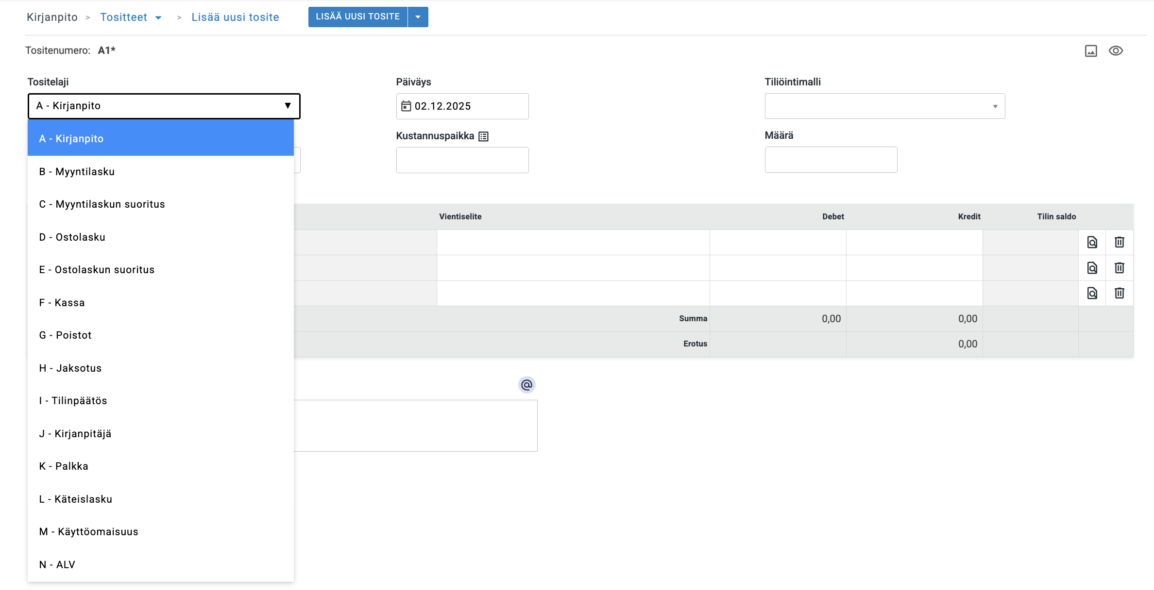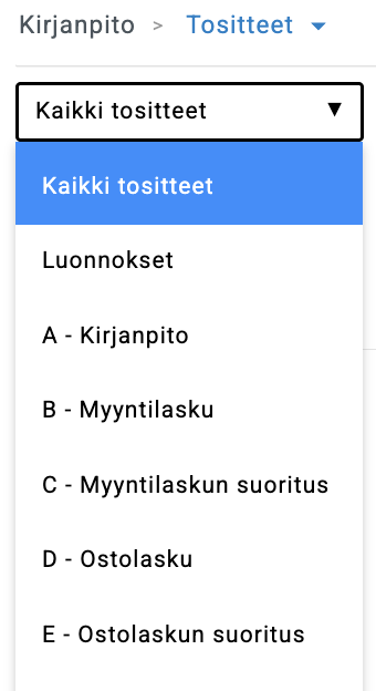 Voit myös itse luoda manuaalisesti tositelajeja, joita voi valita, kun luot uuden tositteen Kirjanpito → Tositteet-välilehdellä, ja valitset tositelajin Kaikki tositteet -pudotusvalikosta. Tositelajit voi myös asettaa näkyville Pankki → Käsittele tapahtumat -näkymään.
