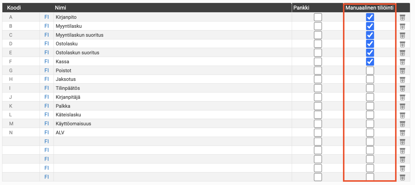 Valitse Manuaalinen tiliöinti -valintaruutu yhdelle tai useammalle tositelajille, jolloin ne näkyvät Kirjanpito → Tositteet → Lisää uusi tosite → Tositelaji -näkymässä tositteiden manuaalisen rekisteröinnin yhteydessä.