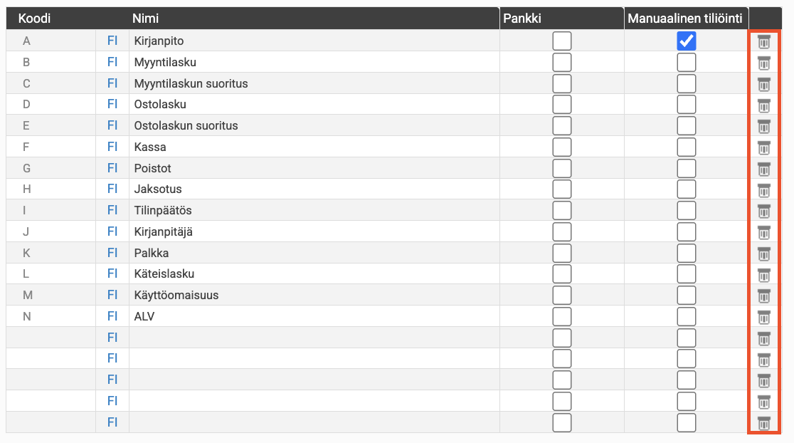 Voit poistaa sarjan roskakoria napsauttamalla. Voit poistaa vain sarjoja, joita ei ole käytetty vielä tileissä.