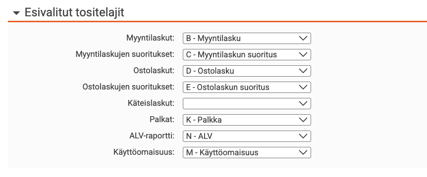 - Voit hallita esivalittuja tositelajeja ohjelman kohdasta Asetukset → Kirjanpito → Tositesarja → Esivalitut tositelajit.