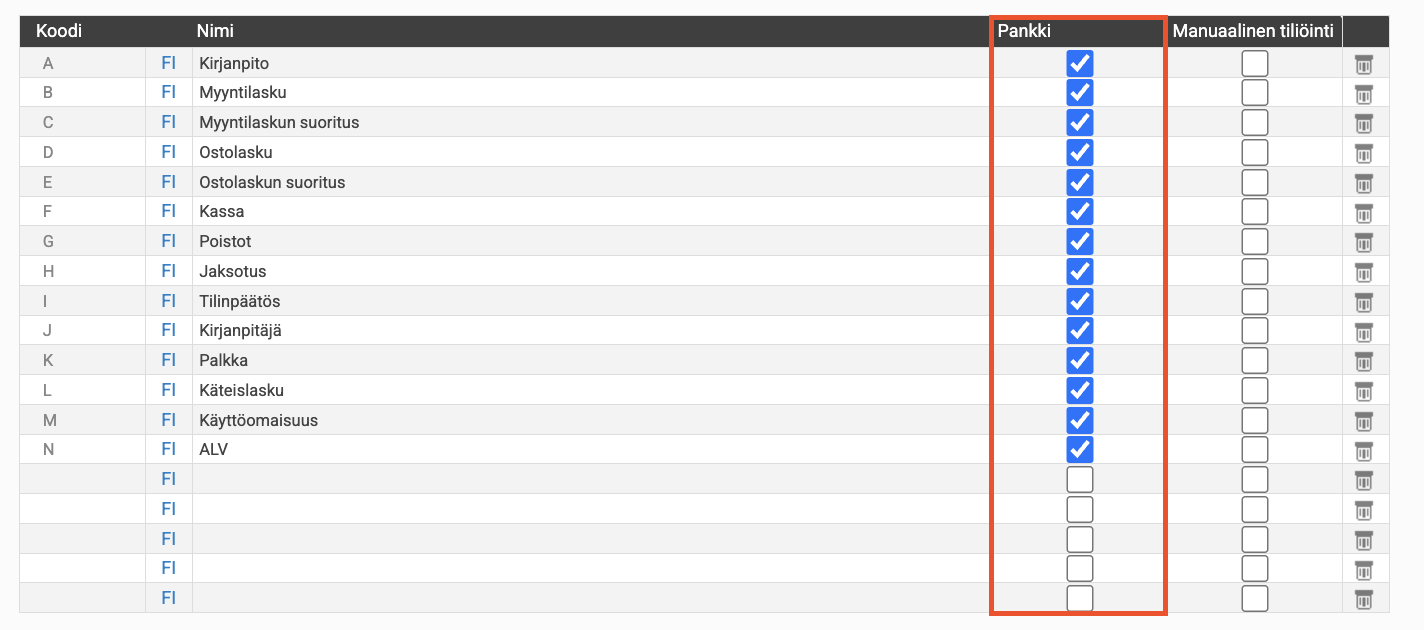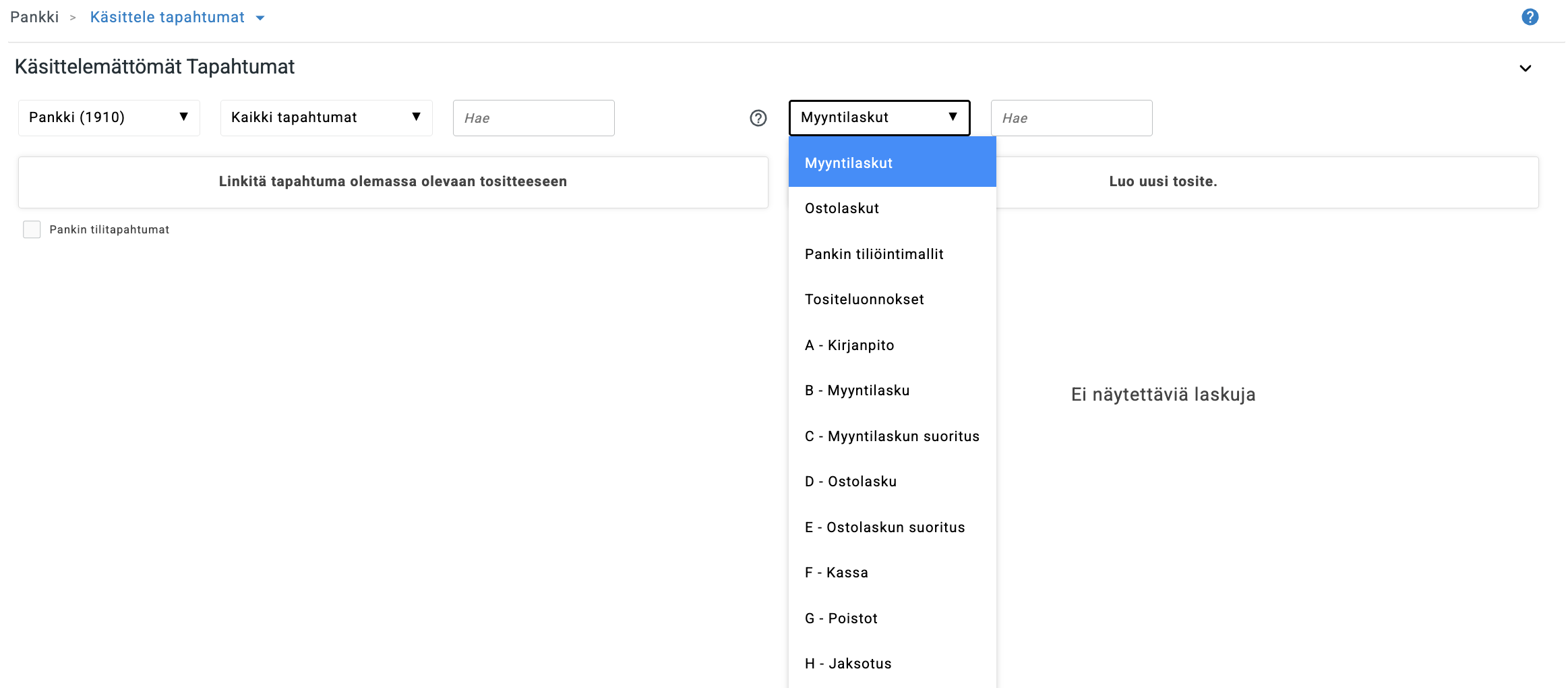 Valitse Pankki -valintaruutu, niin tositelajit näkyvät Pankki → Käsittele tapahtumia -näkymässä.
