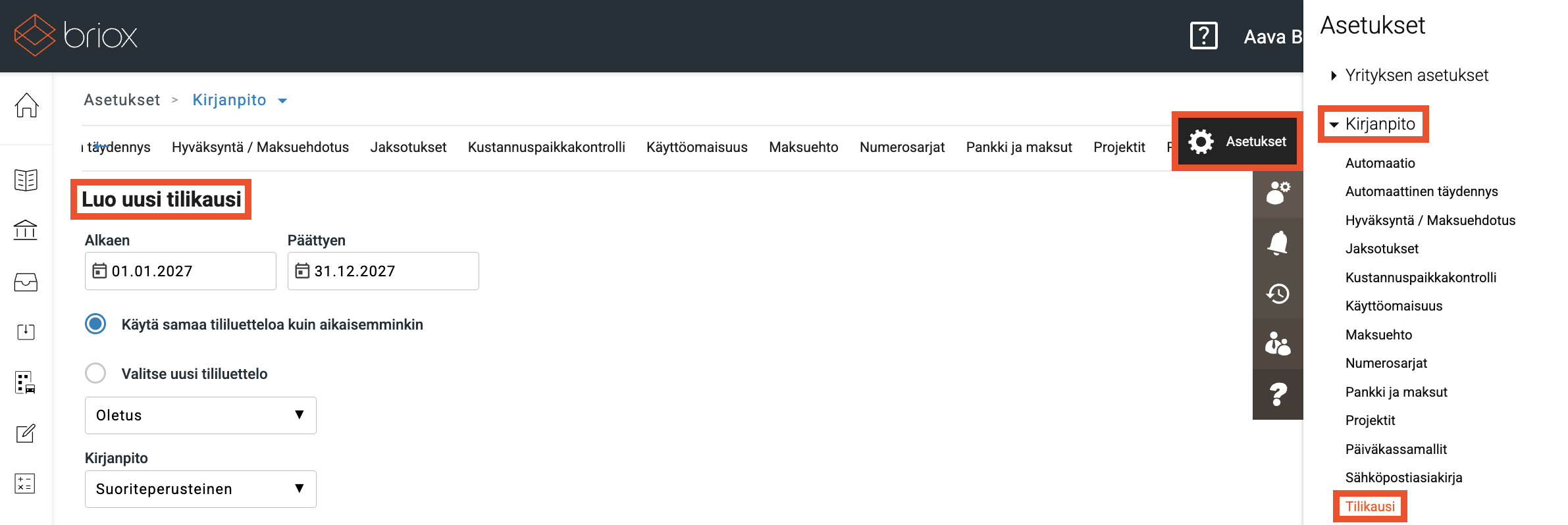 Mene kohtaan Asetukset → Kirjanpito → Tilikausi / tai paina Brioxin oikeassa yläkulmassa olevaa Kalenteri -symbolia.