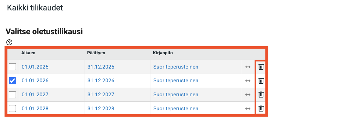 Huom: Voit poistaa tilikauden vain, jos et ole tehnyt siihen mitään kirjauksia.
