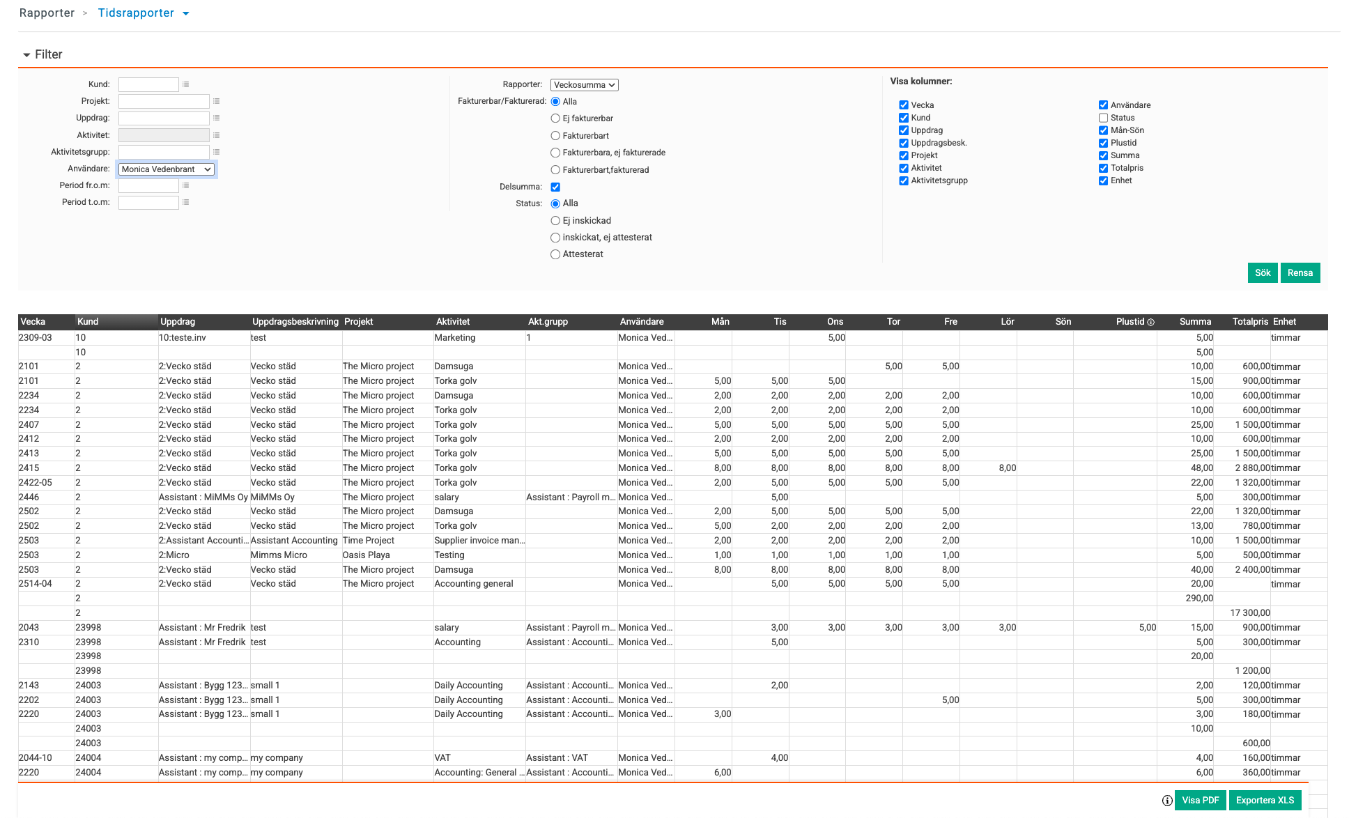 Raportti tarjoaa useita vaihtoehtoja, joiden avulla voit tarkastella raportoitua aikaasi monella eri tavalla. Esimerkiksi käyttäjäkohtainen aika, tehtävä, jakso, laskuttamaton aika, hyväksytty aika jne.