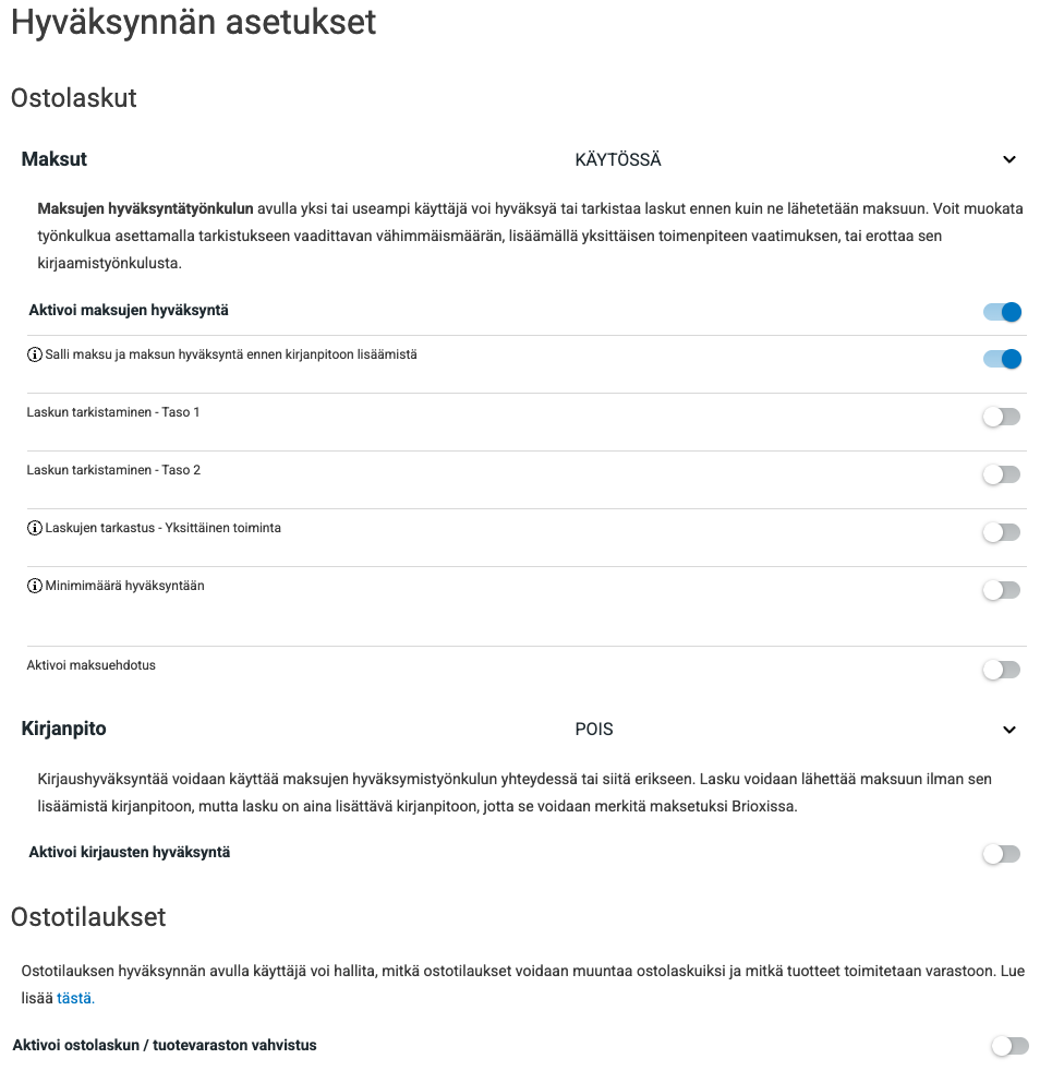 - Osa ostolaskuista siirtyy suoraan ostoreskontraan asetuksista riippuen.