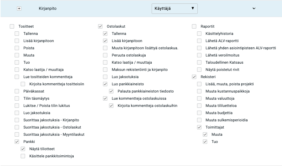 - Maksut kirjautuvat kirjanpitoon lisätyille ostolaskuille sitä mukaan kun tiliotteet saapuvat ohjelmaan.