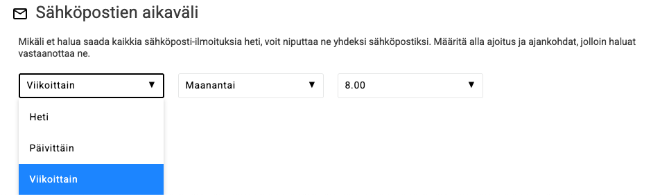 Sivun alalaidasta asetetaan sähköposti-ilmoitusten ajoitukset.