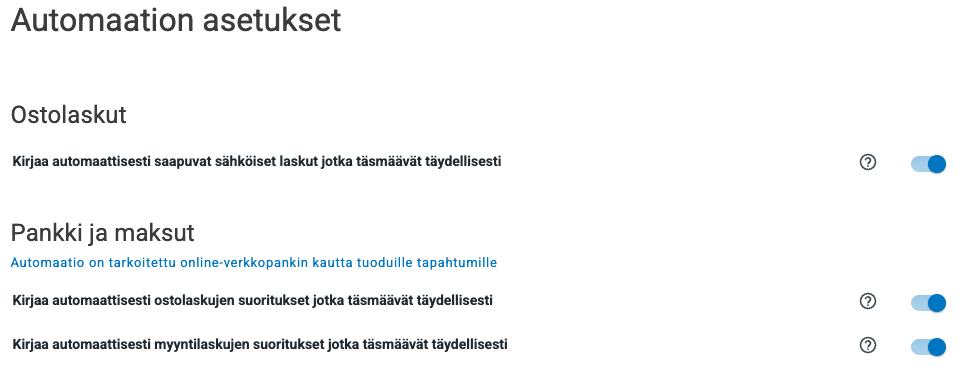 Alempana voi kytkeä päälle myynti- ja ostoreskontran automaattiset maksusuoritukset, mikäli ne löytyvät oikeilla tiedoilla tiliotteelta.