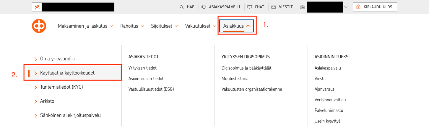 1. Kirjaudu sisään, valitse asiointirooliksi yritysasiakkuutesi ja avaa "Asiakkuus".