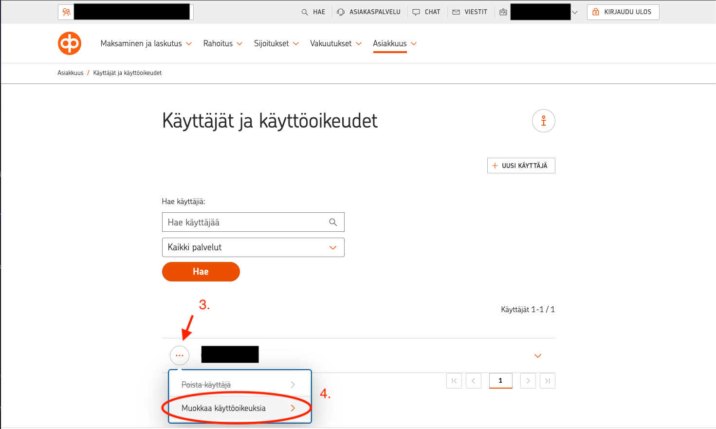 3. Valitse oikea käyttäjä ja paina sen vierestä löytyvästä kolmesta pisteestä.