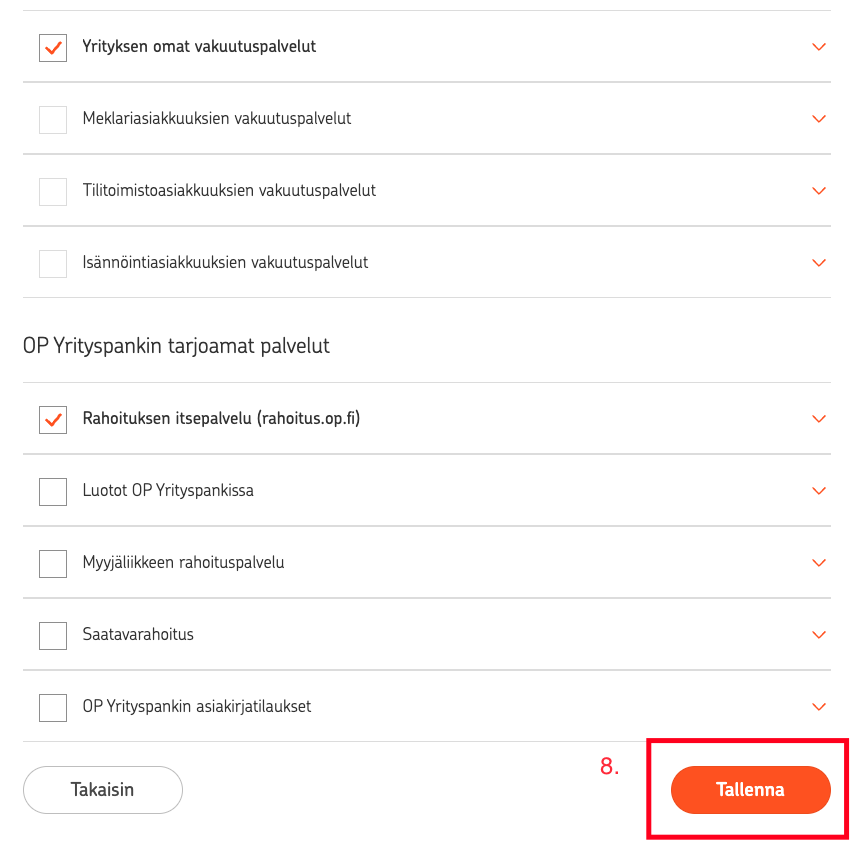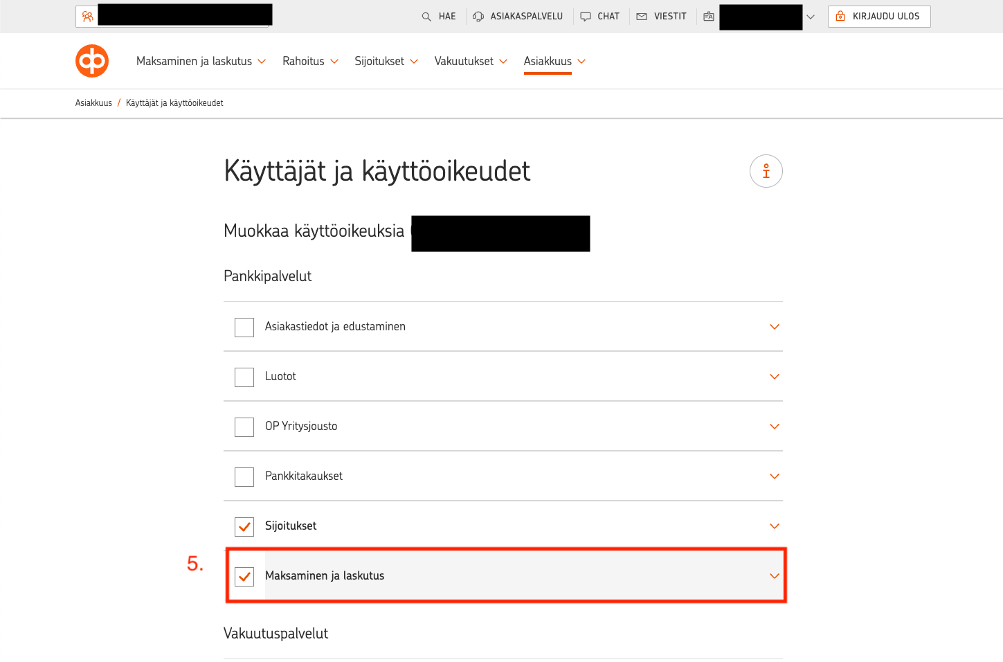 5. Laajenna Pankkipalvelut-osiosta "Maksaminen ja laskutus". Älä paina täpästä, mikäli se on päällä.