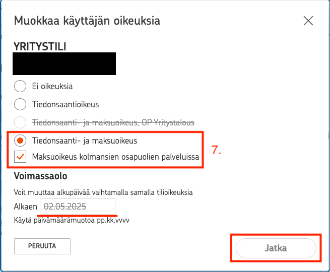 7. Valitse "Tiedonsaanti- ja maksuoikeus" sekä "Maksuoikeus kolmansien osapuolien palveluissa". Valitse voimassaolon alkupäivä ja paina Jatka.