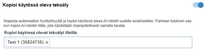 Uusia asiakkaita lisättäessä voit kopioida yhden tai useamman robotin, jonka olet kouluttanut muissa tileissä. Näin sinun ei tarvitse aloittaa alusta jokaisen uuden asiakkaan kanssa.