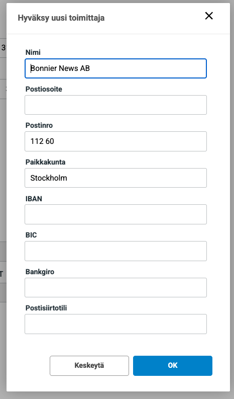 Jos tulkittu ostolasku (pois lukien verkkolaskut) saapuu toimittajalta, jota ei vielä ole toimittajarekisterissä, Briox luo automaattisesti uuden toimittajan laskulta tulkittujen tietojen perusteella.