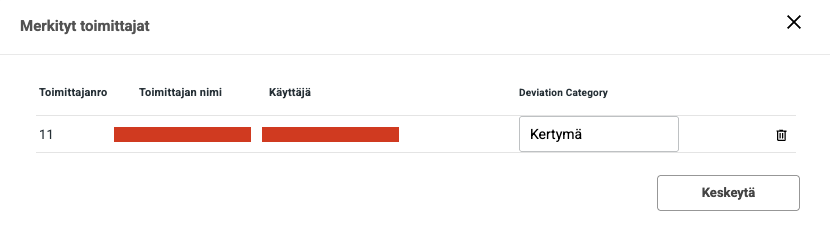 Ikkuna näyttää kaikki toimittajasi, joiden viereen voit lisätä syyn merkinnälle