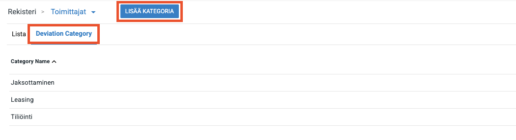 Siirry kohtaan Rekisteri → Toimittajat ja valitse Toimittajakategoriat -välilehti