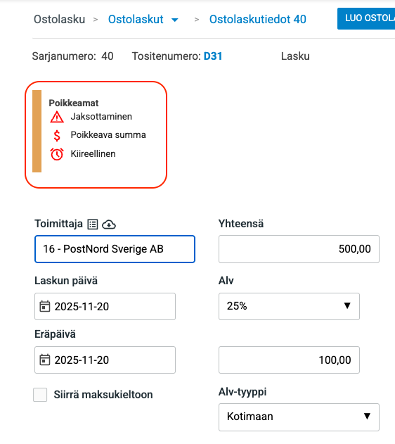 - Varoitukset: Merkittyjen ostojalaskujen käsittely