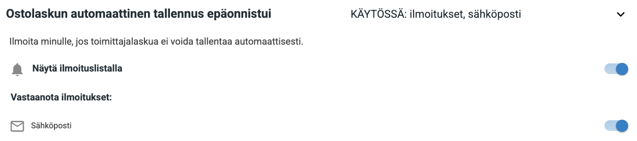 Kun tämä asetus on käytössä, kaikki saapuvat laskut, jotka täsmäävät täydellisesti, kirjataan järjestelmässä automaattisesti päivittäin. Ilmoitus kertoo, mitkä laskut on kirjattu automaattisesti.