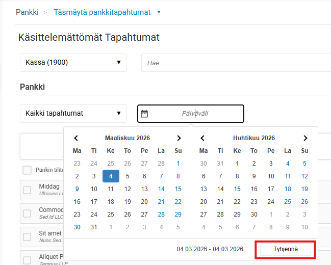 Uuden päivämääräsuodattimen avulla voit suodattaa pankkitapahtumia ajanjakson perusteella (esimerkiksi kuukausittain).