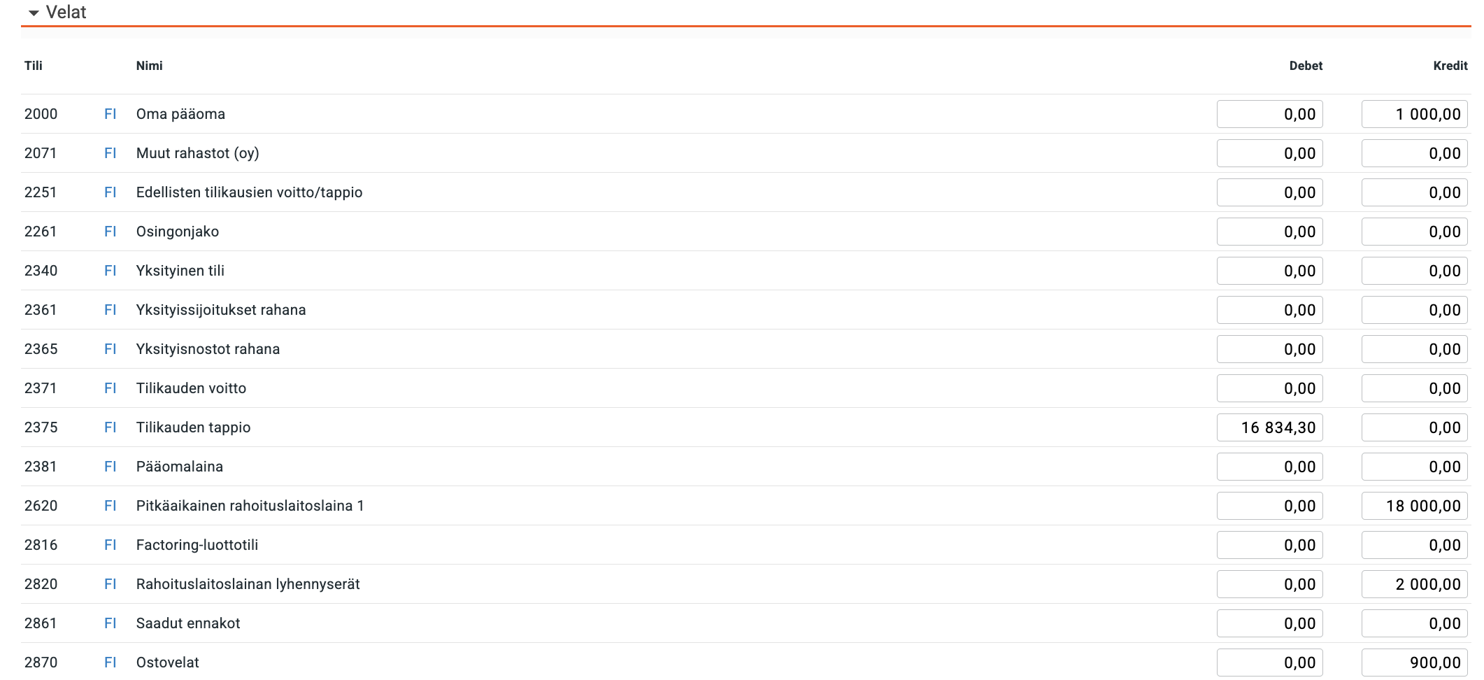 Alkusaldot voi myös kirjoittaa manuaalisesti suoraan kunkin tilin Debet- ja Kredit-sarakkeisiin Rekisteri → Tililuettelo → Alkusaldot: