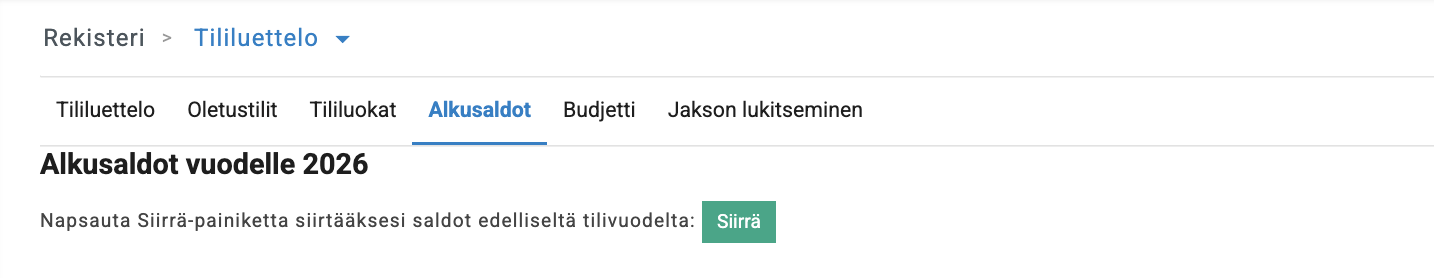 Kun myöhemmin luot uutta tilikautta, siirrä alkusaldot tavalliseen tapaan Rekisteri → Tililuettelo → Alkusaldot.