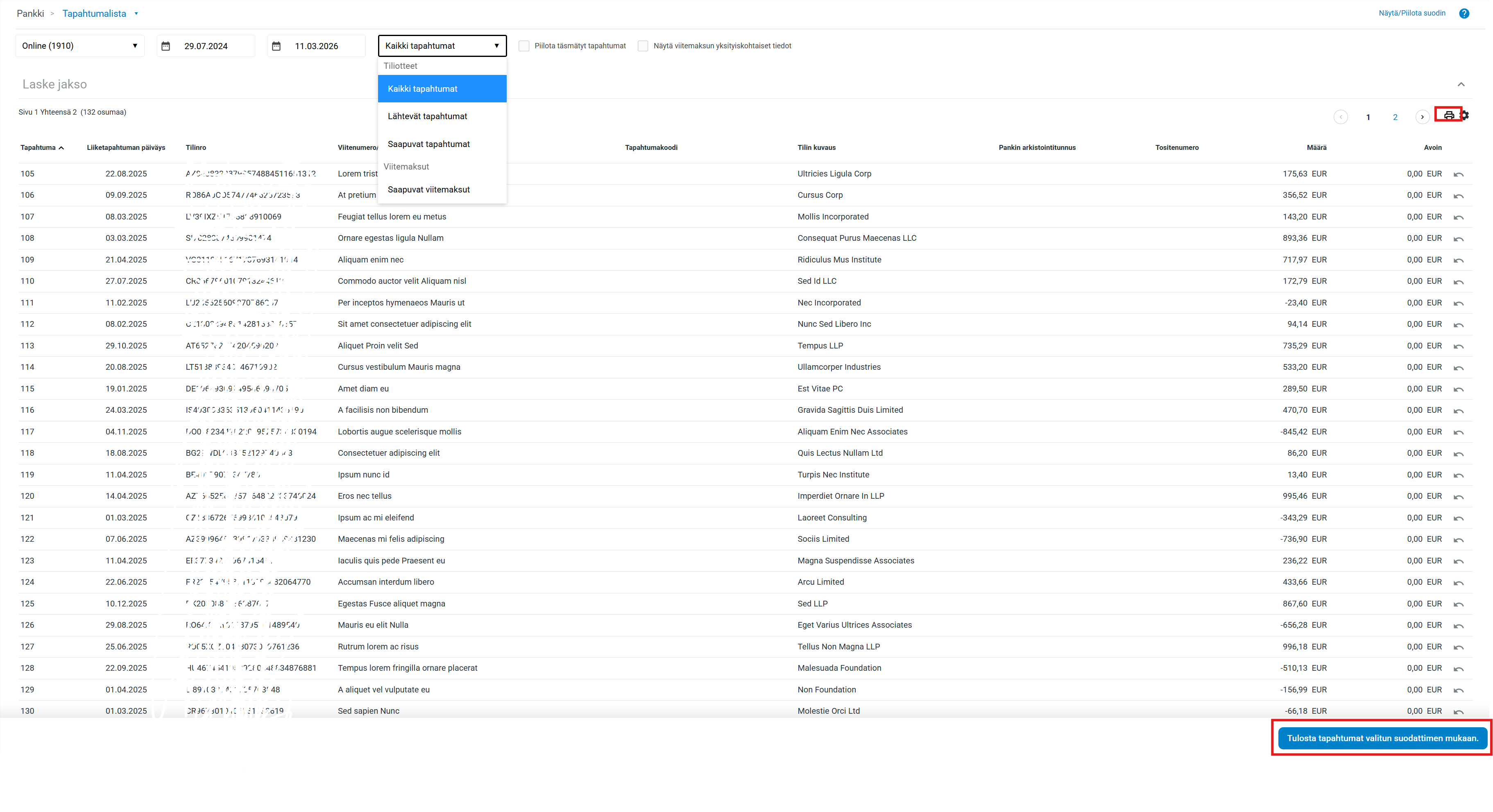 Pankki → Tapahtumalista -näkymässä näet kaikki pankista tuodut tilitapahtumat.