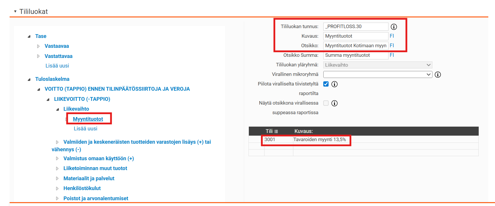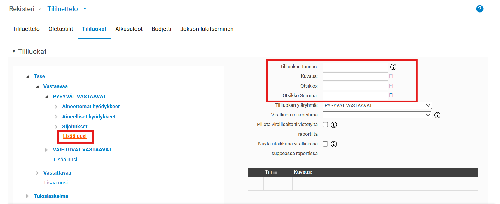 Jos haluat muokata tililuokkapuuta, voit luoda uusia tililuokkia klikkaamalla Lisää uusi siinä kohdassa, johon haluat lisätä uuden tililuokan. Tämä on mahdollista kaikilla tasoilla. Täytä tililuokan tiedot oikeassa sarakkeessa ja muista tallentaa.