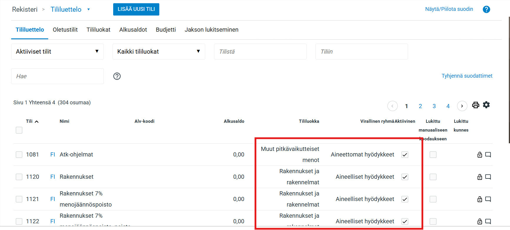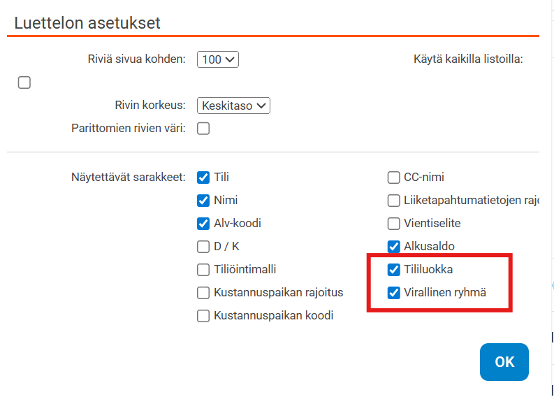 Tämän jälkeen listassa näkyy kaksi saraketta, jotka kertovat, mihin tililuokkaan ja viralliseen ryhmään kukin tili on liitetty.
