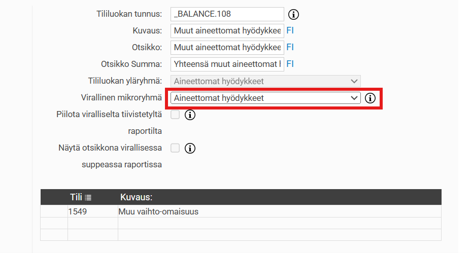 Jotta Micro Tase- ja Tulosraportit (Suomi) voidaan muodostaa, olemme luoneet viralliset ryhmät, joihin tililuokat voidaan liittää.