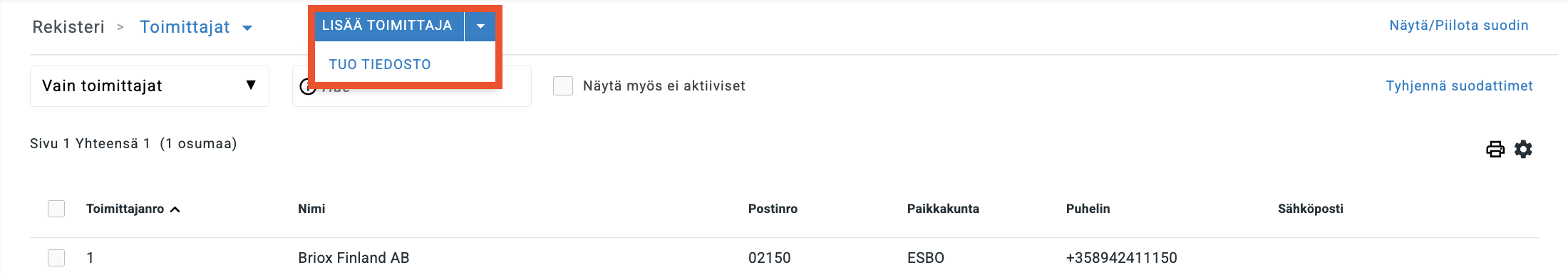 Jos haluat kumota tuonnin ja poistaa tuodut toimittajat, klikkaa roskakorikuvaketta rivin lopusta.Löydät toimittajaluettelosi kohdasta Rekisteri → Toimittajat. Voit nyt käyttää näitä toimittajia, kun luot ostolaskuja.