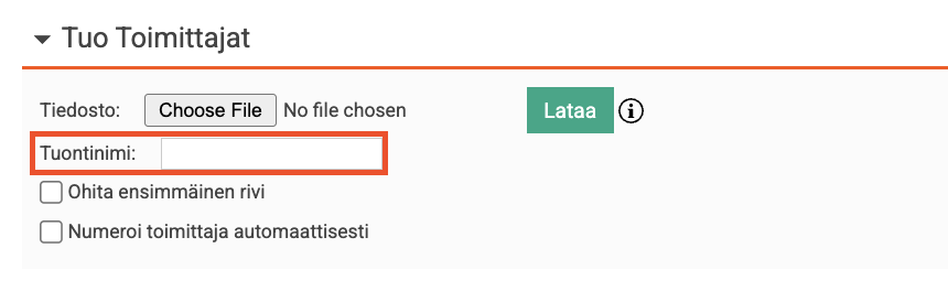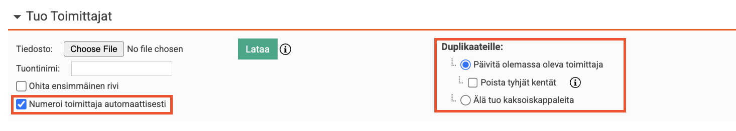 Valitse Numeroi toimittaja automaattisesti, jos haluat ohjelman luovan toimittajanumerot.