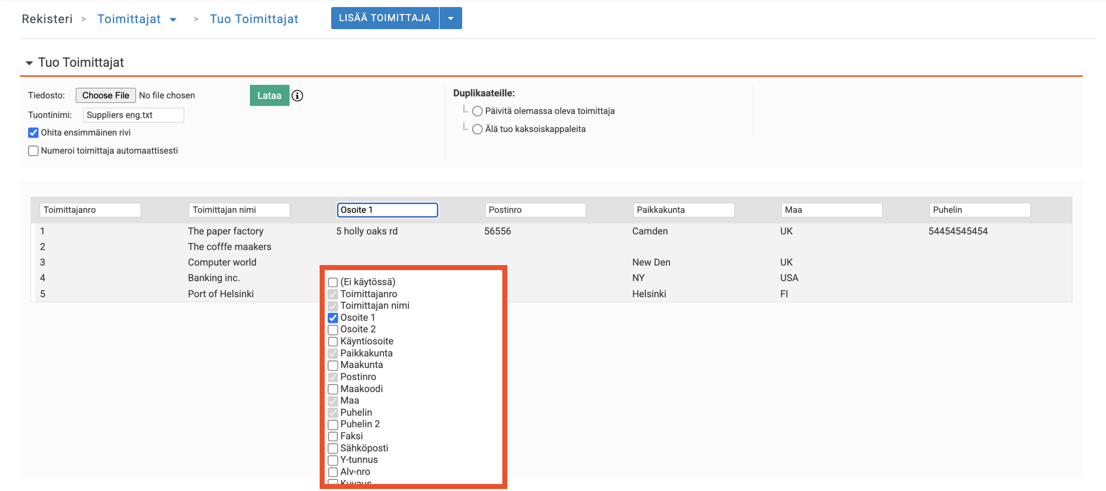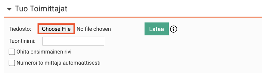 Siirry kohtaan Rekisteri → Toimittajat → Tuo tiedosto.