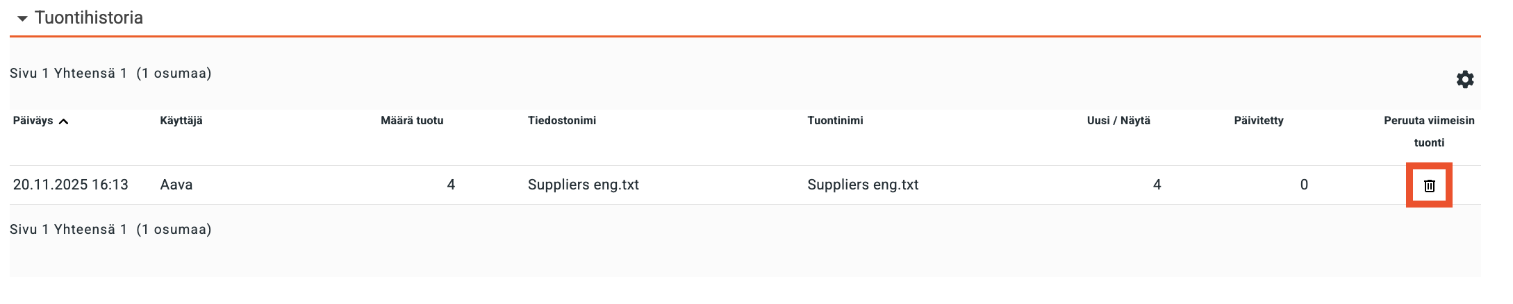 Kun tuonti on valmis, se kirjautuu Tuontihistoria-osioon tuontikenttien alle.